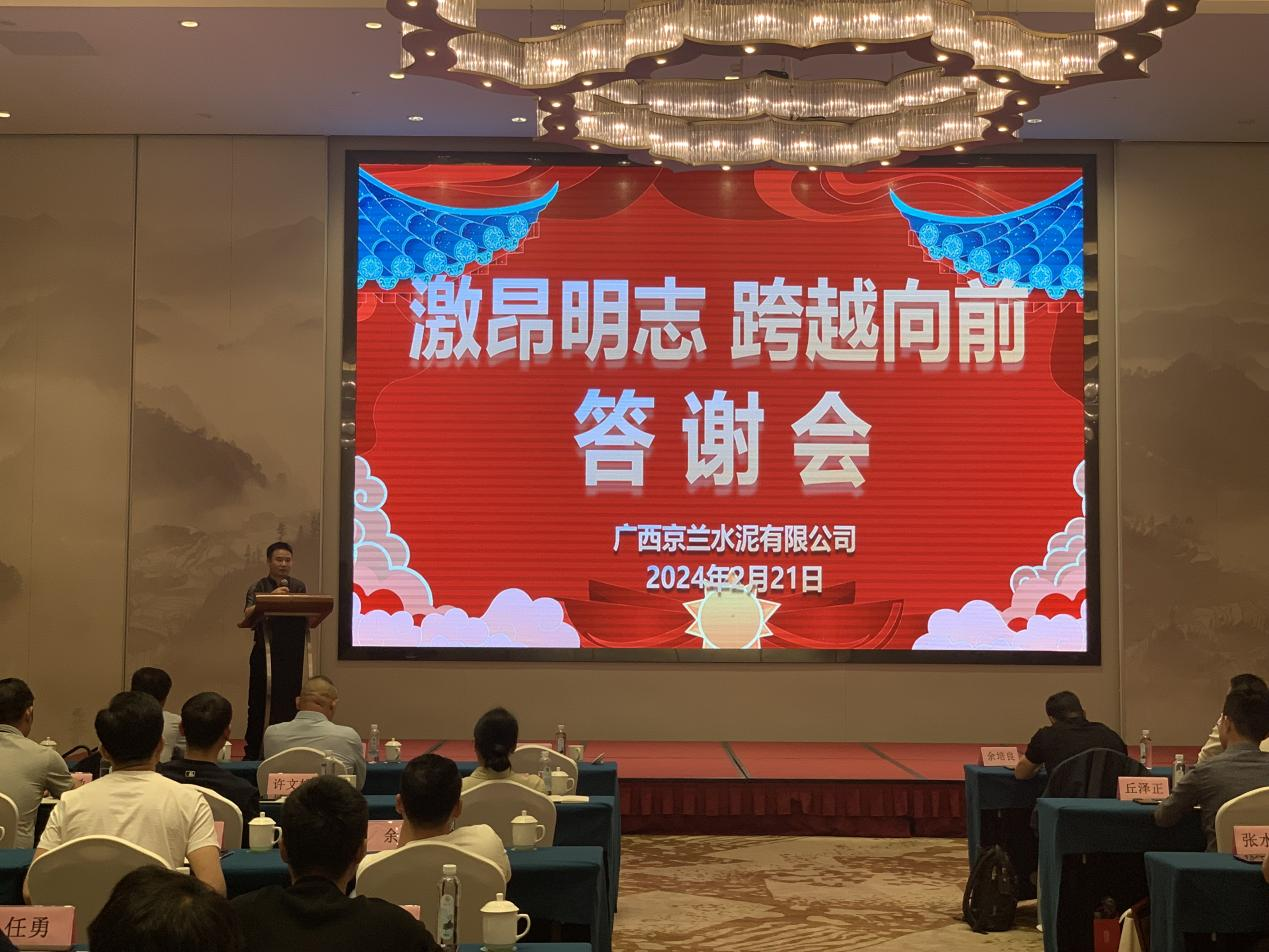 2024年2月21日,廣西京蘭水泥有限公司在柳州蓮花山莊召開以“激昂明志,跨越向前”為主題的2023年度代理商年終總結(jié)大會暨答謝會,共有來自兩廣各地近20個(gè)地市、40余位合作代理商參加了本次盛會,會議在熱情洋溢的氛圍中成功舉辦。